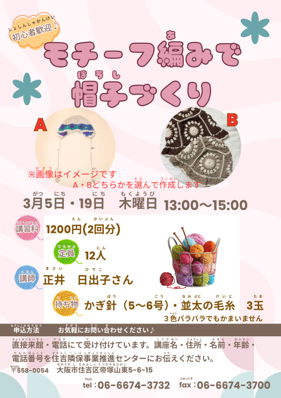 持ち物:かぎ針(5から6号)・並太の毛糸3玉